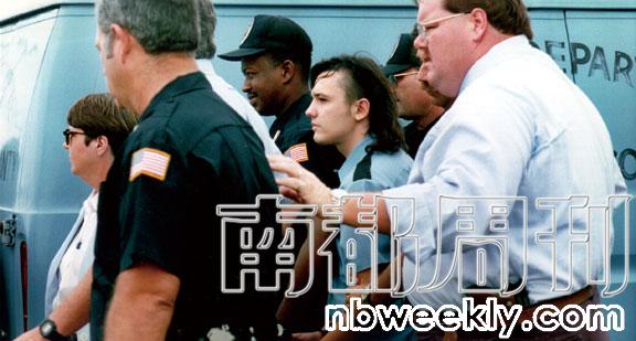 1993年6月4日,涉嫌凶残杀死3名男童的达米安・艾克尔斯(中,长发者),在阿肯色州被警局提审。