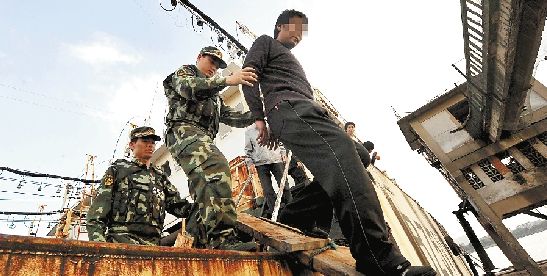 逃亡15年后,刘玉杰昨天被边检战士带下渔船 记者盛高 摄