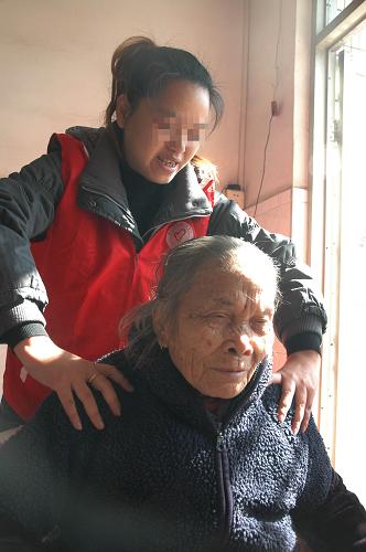 12月4日,志愿者伍丽京在当地敬老院为老人按摩。新华社记者田建川摄