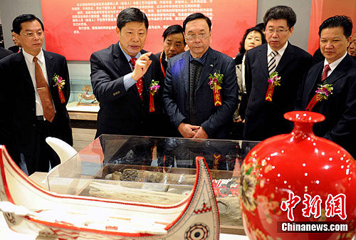 12月20日,由海峡两岸监狱矫正机构共同举办的首届海峡两岸监狱服刑人员(收容人)书画工艺作品联展在福建省博物院开幕,展出服刑人员书法作品18幅、绘画作品54幅、工艺作品共112件。图为出席本次联展开幕式的台湾矫正机构大陆参访团团长、矫正机构主要负责人吴宪璋(左二)向观展嘉宾介绍展出的台湾参展作品。中新社记者 刘可耕 摄