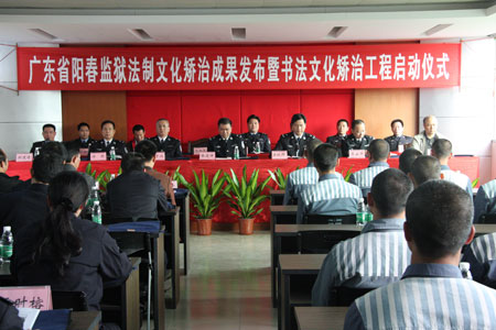为深入贯彻落实十七届六中全会精神,加强监狱文化建设,近日,广东省阳春监狱举行法制文化矫治成果发布暨书法文化矫治工程启动仪式。省监狱管理局副局长张道坤出席并致辞。省监狱管理局有关业务处室负责人,省监狱系统心理咨询师、书法家,阳江市书法家,阳春监狱领导班子、部分警察、服刑人员代表,以及阳江市新闻媒体记者共130多人参加了活动。