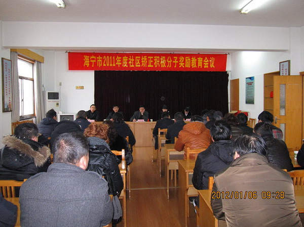 2012年1月6日上午,海宁市召开2011年度社区矫正积极分子奖励教育会议,市社区矫正相关部门领导、市镇两级社区矫正工作人员参加会议,全市30名表现优秀的社区服刑人员到会接受表彰。