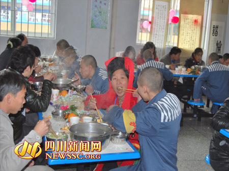 镜头三:“预备,开始!”随着管教一声令下,服刑人员家庭全家动员,开始了包饺子比赛。舀馅、捏皮,七岁的周小花(化名)做得有模有样。最后,服刑人员周雷(化名)一家以56个饺子获得冠军。15分钟后,热气腾腾的饺子端上了桌。“女儿呀,你正是长身体的时候,多吃点。”“爸爸,你也多吃点,在里面保重身体,我和妈妈都等你回来。”面对懂事的女儿,看着满眼泪水的妻子,周雷含泪咽下了这个爱意浓浓的饺子。