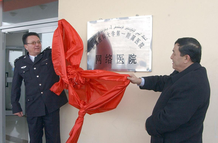 图为副局长吐尔逊•加马力与新医大一附院副院长帕尔哈提•拜合提为网络远程会诊医院揭牌。(新疆法制报记者郑旭磊摄)