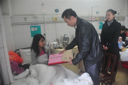 “谢谢江门监狱的叔叔阿姨们,虽然我爸爸妈妈不在我身边,但有你们的关心和鼓励,我将不再害怕,我一定会勇敢坚强地与病魔作斗争,争取早日康复重返校园…”病床上的罗婉芳同学满含泪水哽咽地说,拉着江门监狱政治处领导的小手久久不愿放开。这是2月22日发生在江门市中心医院儿科病房的感人一幕。