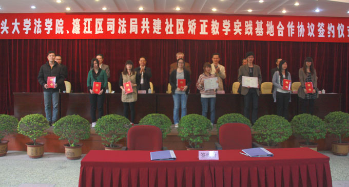 3月28日,汕大法学院与汕头市濠江区司法局在濠江区委会议中心举行共建“社区矫正”教学实践基地合作协议签约仪式并为志愿者颁发证书,标志着“社区矫正”教学实践基地正式成立,双方将在未来两年展开合作,共同开展“社区矫正”工作。法学院 25名学生成为濠江区首批社区矫正工作志愿者。