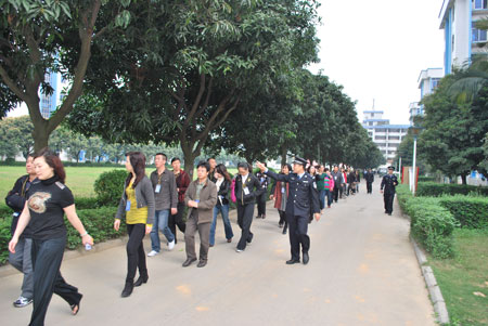 服刑人员家属在番禺监狱警察带领下参观监管区