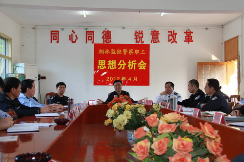 桐林监狱2012年警察职工4月份思想分析会于4月10日下午召开,监狱领导班子成员、监区正职领导、各科室主要负责人以及政治处全体人员参加了会议。会议分析讨论了监狱4月份警察职工思想和各项工作中存在的问题,监狱领导对有关问题给予了解答,并强调了今后开展各项工作应注意的问题和事项。覃世富监狱长、黄斌政委等领导在会上作了重要讲话,会议由陈运林副政委主持。