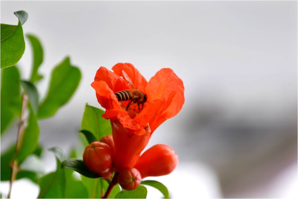 广西区鹿州监狱警察职工生活区(和谐小区)里,种有一片石榴树。5月8日,作者路过,看到蜜蜂在石榴花上采蜜的勤劳场面,为它们的精神所感动,就用尼康D90相机(18―105MM镜头)拍了几张。广西区鹿州监狱宣传科罗庆梅 摄