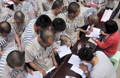 当日,河北省邢台监狱和邢台市桥西区人力资源市场在邢台监狱举办了一场特殊的招聘会,300余名即将刑满释放人员与30余家企业“面对面”双向选择,当天260余人与企业签订了用工意向书。 据了解,邢台监狱近年来把刑期变学期,开办服装制作、电池装配、园林绿化、中式烹调等职业技术培训班。三年来,3000余名服刑人员取得职业资格培训结业证,为重回社会开始新的生活打下了基础。 新华社发(黄涛 摄)