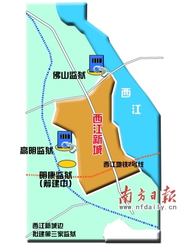高明未来中心城区西江新城遭遇监狱围城,在其周边原有的佛山监狱、高明监狱的基础上,近日传出,这里将再建第三家监狱―――明康监狱(暂定名),用来集中关押全省病犯。