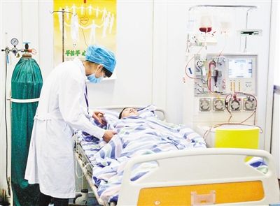 6月14日,医生正在给白血病患儿高俊杰的父亲高勇采集外周血干细胞 记者 熊明 实习生 胥国庆 摄