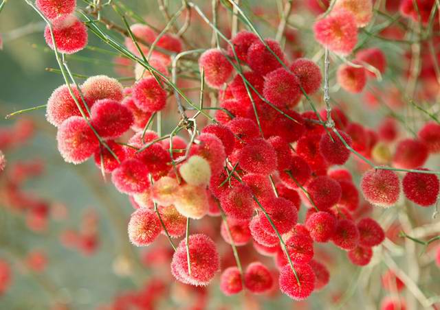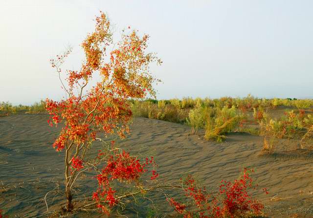 吐鲁番这个季节的梭梭,是最神奇、最美丽的,似乎将积蓄了一年的力量完全迸发在枝头,满树的花朵像串串硕大的葡萄,又仿佛一棵棵鲜艳欲滴的杨梅,绿的清新、红的晶莹,虽然没有绿叶的陪衬,甚至连树干都没有漂亮的颜色和规则的形状,但它以那种对风沙和干旱无所畏惧的姿态,毫无顾忌地绽放,绝不输给漫漫黄沙,演绎出一首生命的千古绝唱,令人肃然起敬。