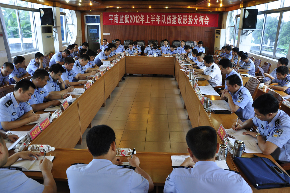 为了全面总结回顾2012年上半年监狱党员、警察队伍的思想动态,分析当前面临的形势,更好地部署下半年工作任务,确保监狱的安全稳定,广西平南监狱坚持实行党员、警察队伍建设定期分析制度,于7月17日召开2012年上半年队伍建设形势分析会。