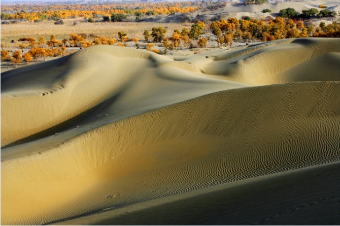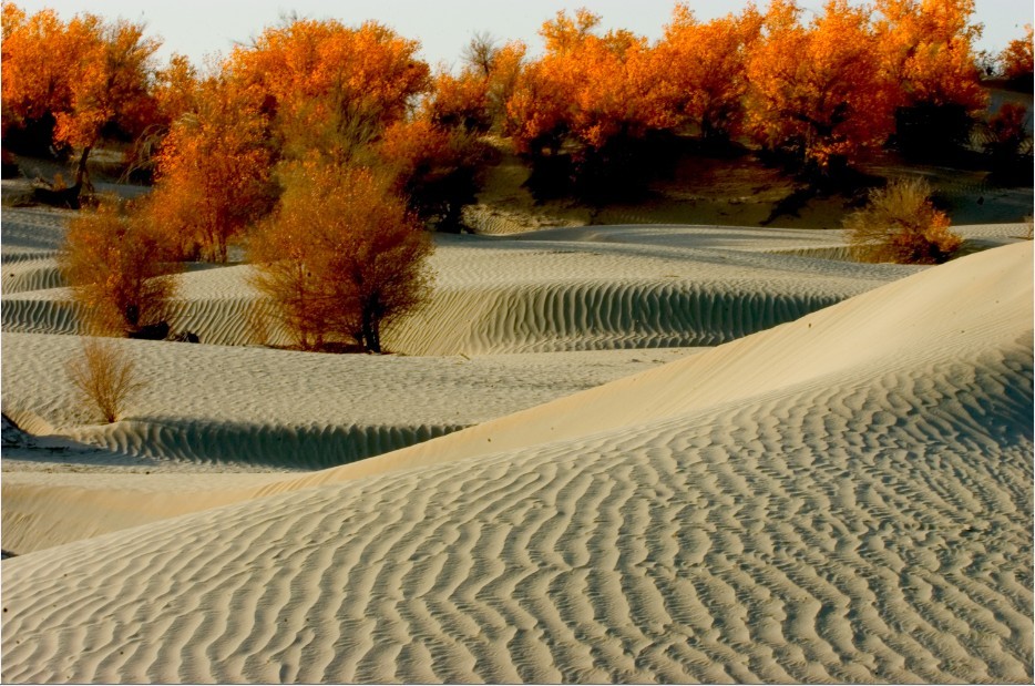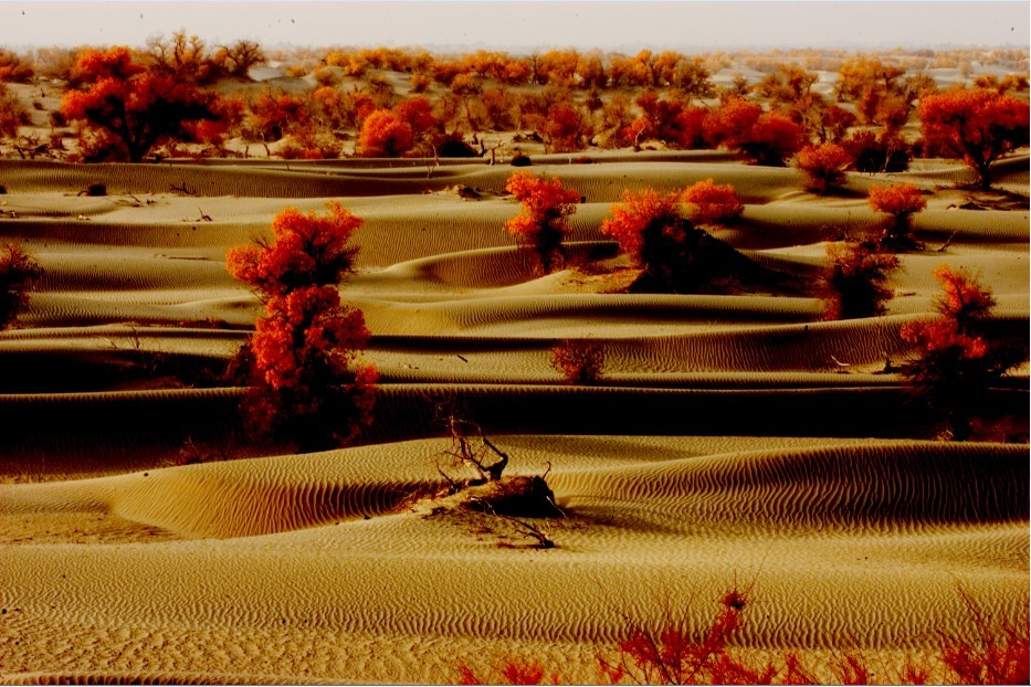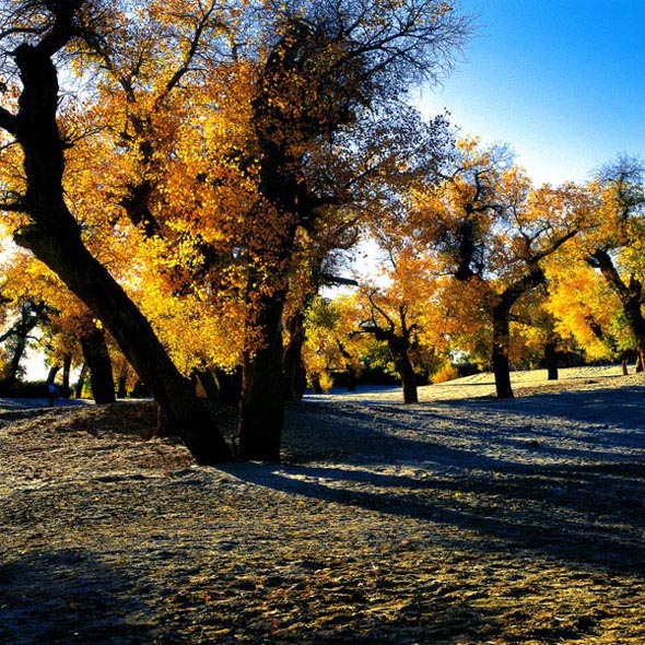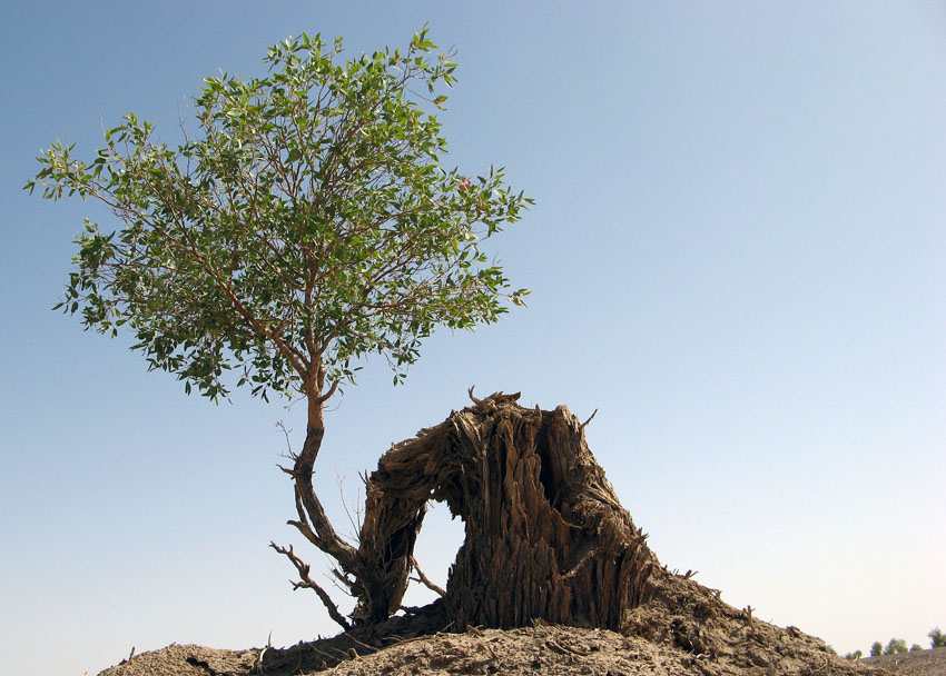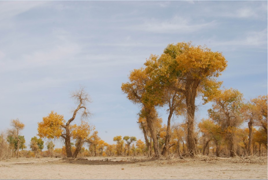 胡杨树,被世居于此的维吾尔族人称为“英雄树”,有“生下来千年不死,死后千年不倒,倒下去千年不朽”的说法。胡杨是随青藏高原隆起而出现的古老树种,中国塔里木盆地分布着世界最大的胡杨原始森林。在干旱少雨的沙漠地带,胡杨可将根扎进地下50多米,顽强地支撑起一片生命的绿洲。置身塔克拉玛干沙漠,看着一株株与命运抗争的胡杨,令人由衷地感叹生命的顽强。从合抱粗的老树,到不及盈握的细枝,横逸竖斜,杂芜而立。然而,无论柔弱,无论苍老,总有一抹生命的绿色点染着枝梢。很少有人能够明白,正是无言流淌的塔里木河孕育出这一片片不屈的生命。胡杨,见证了亿万年间的海陆变迁,又度过了冰川时代,如今,它正在面对新的灾难。缺水正在使大片的胡杨林走向衰败,它们的后代却难以成长。