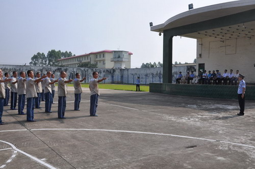 评审工作组一行在贵港监狱高延钧政委、张洪监狱长、纪委钱跃光书记和相关科室领导的陪同下到监舍现场进行实地察看,按照基地开展警示教育活动的相关内容进行了参观。评审组首先到监区了解服刑人员从事来料加工生产状况,接着到监舍参观服刑人员的生活环境,随后到狱内起航广场观看服刑人员表演《感恩的心》手语操和队列操练,然后到警示教育展厅进行参观,最后来到狱内起航电视台,观看了电视台录制的电视节目。