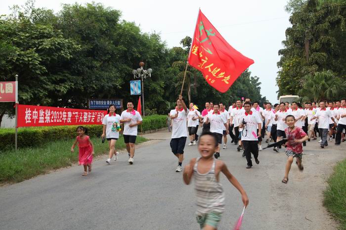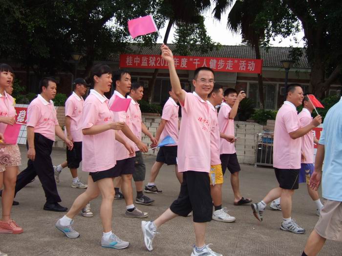 “每天锻炼一小时,健康生活一辈子”,在第四个“全民健身日”到来之际,8月8日下午19时,广西桂中监狱举行了“千人健步走”活动。来自该监狱的在职警察、职工、离退休老同志和驻监狱武警官兵共1000余人身着统一款式服装,围绕监狱办公区、生活区及周边区域进行了总长3000多米的健步走活动。