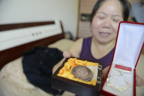 李建华妻子向记者展示其生前获得的荣誉勋章