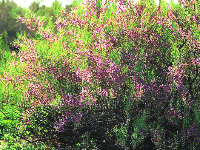 穿越茫茫戈壁,有一种植物定会引起你的惊奇和注目,它叶绿,花红,枝柔韧,一簇簇一团团一丛丛,迎风摇曳,葱茏茂盛,星罗棋布般扎根于一个个沙包之上,为荒凉的戈壁披上淡雅的红裳……