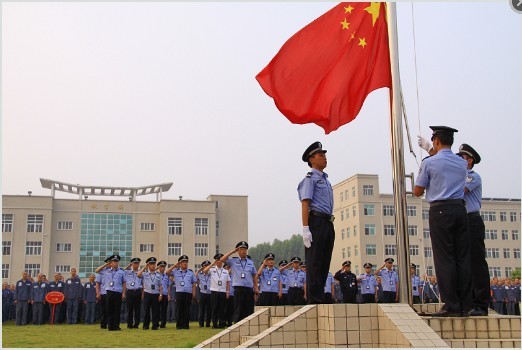 十月一日早上7:30,升国旗仪式正式开始。3000余名服刑人员在民警组织下,在监内广场上衣着规范、整齐列队。三名英姿威武的民警升旗手和护旗手,肩扛国旗,左右护旗,在进行曲迈着标准有力的正步,来到旗杆下动作干净利落地将国旗挂在旗杆上,随后,在庄严的国歌声中扬旗、升旗,鲜艳的五星红旗徐徐升向杆顶,全体民警行举手礼,服刑人员行注目礼,庄严地注视着五星红旗冉冉升起,迎风飘扬。