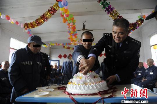 集体生日会上,狱警和老年服刑人员一起切蛋糕。 卢洋 摄