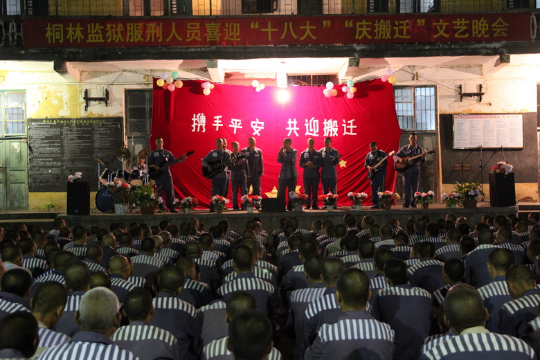 在全国人民喜迎十八大,全体干警喜迎搬迁的日子里,这些既给我们带来希望、期待,同时也给我们带来压力,因此广西区桐林监狱决定在10月17日晚上在二监区举办主题为――“保平安,迎搬迁”的文艺晚会,此次晚会由我监服刑人员自编自导自演,包括歌曲、吉他弹唱、朗诵、小品等节目,为现场400多名服刑人员奉献了一顿文艺大餐。