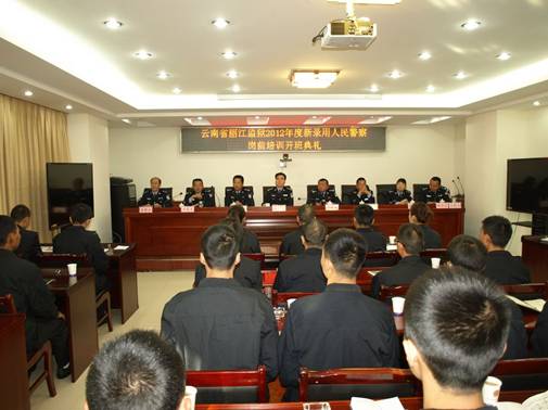 10月22日上午,丽江监狱举行了2012年度新招录人民警察岗前培训开班典礼,监狱全体党委委员、政治处全体工作人员以及新招录21名警察参加开班典礼。