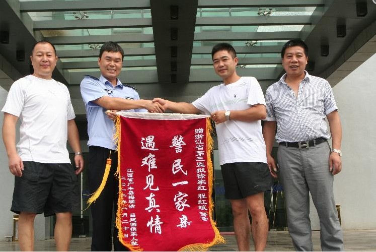 8月22日,来自江西广丰的车祸伤者家属代表梅端清和吕建国,将一片感激之情,连同特意赶制的锦旗,送到三监民警徐家红和驾驶员程江斌的手上。