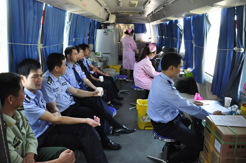 上午十点,贵港市中心血站的献血车一开到平南监狱监部,事先在那等待的多名警察职工就登上了献血车献血。大家认真地填写登记表,医务人员给他们量血压、验血,并询问了相关情况。最后,经过血液初步筛选,大家不畏针扎之痛伸出手臂,奉献一份份爱心。整个过程井然有序,一直进行到下午一点。