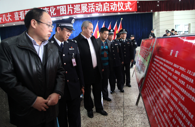 11月19日,由自治区监狱管理局、乌鲁木齐市委宣传部、市文化局、市图书馆联合举办的“迎接党的十八大 喜看新疆新变化”图片巡展月启动和揭幕仪式在自治区第五监狱举行。