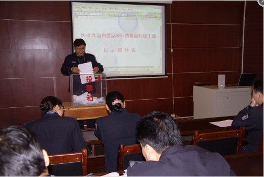 11月28日上午,广西宜州监狱在会议室举行了公开推荐选拔副科级干部民主测评会,对获得选拔监狱副科级干部资格的人员进行民主测评。全监现任中层领导及一些民警代表参加了民主测评会,填写《宜州监狱副科级领导、分监区级领导公开推荐选拔量化民主测评表》,进行无记名投票。测评表内容包括德、能、勤、绩、廉等5项。