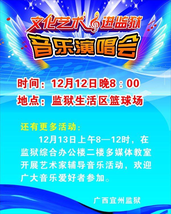 此次“文化艺术进监狱”活动是自治区监狱局党委大力推进广西监狱文化建设而统一部署开展的一次大型文化活动。音乐演唱会是这次“文化艺术进监狱”活动的主要展现内容之一。为配合做好本次活动,宜州监狱从设计舞台、海报宣传、组织观众等多方面都做了充分的准备,确保活动达到预期效果,取得圆满成功。音乐演唱会的举办对宜州监狱今年以来采取多种措施加强文化监狱建设,丰富和活跃监狱文化生活,提高警察职工艺术修养起到良好的补充和促进作用。