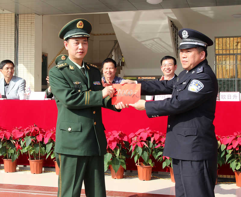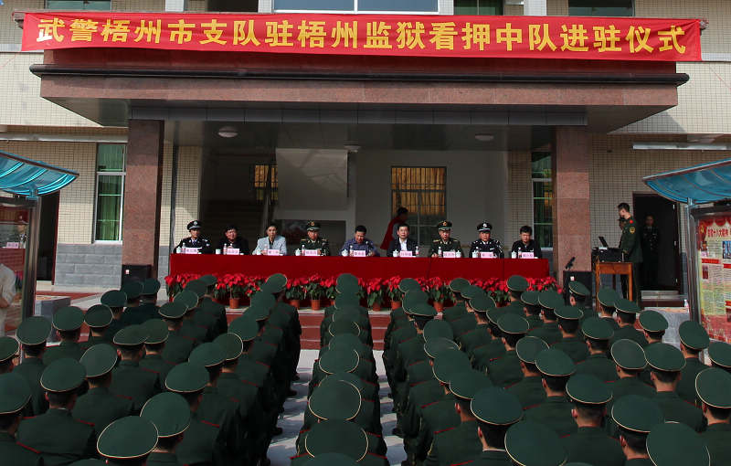 进驻仪式上,梧州市委常委、政法委书记黎永益,梧州市副市长、兼公安局局长朴祥斌,以及梧州监狱黄斌政委,分别做了热情洋溢的讲话,他们对武警中队的进驻表示热烈欢迎,并将全力支持部队的建设与发展。黄斌政委还代表梧州监狱分别向武警支队和中队赠送了慰问金。武警梧州市支队支队长陈学兵、政委欧日升均表示,驻监武警部队将忠诚履行使命,积极做好梧州监狱的看押警戒工作和梧州市的应急处置工作,把军警“三共建设”和军地双拥工作推上新的台阶。驻监武警中队中队长代表中队全体官兵宣读了决心书。