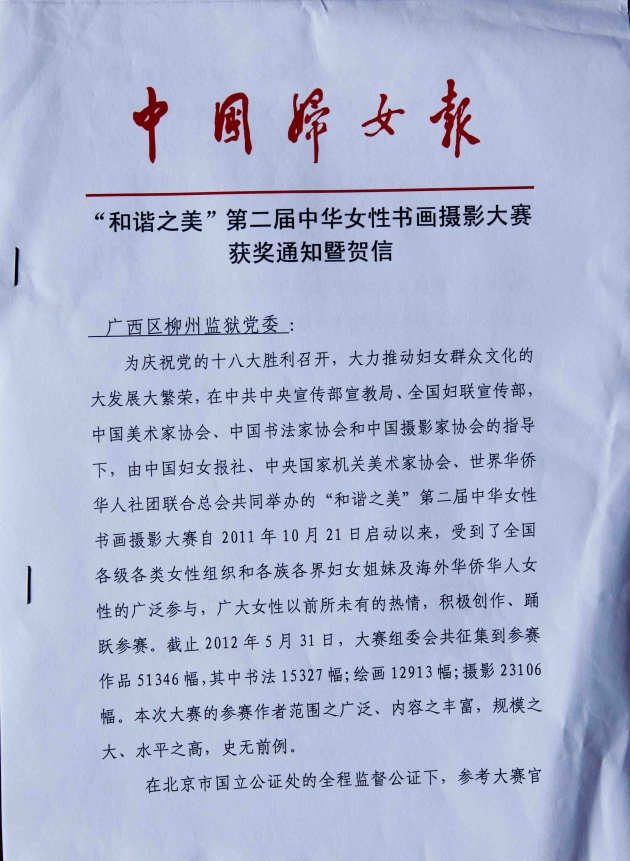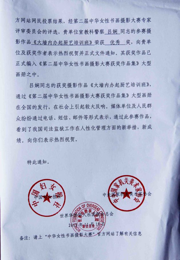 贺信中还说,摄影作品《大墙内办起厨艺培训班》通过《第二届中华女性书画摄影大赛获奖作品集》大型画册在全国发行,在社会引起较大反响。媒体单位及人民群众纷纷通过电话、短信、邮件等形式表示,通过此参赛作品,看到了我国司法监狱工作在人性化管理方面的新举措,新成绩。