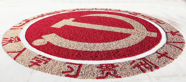 巨幅党徽直径20米,是用260公斤辣椒和350公斤棉花壳组合而成。监区民警首先利用粉笔画出党徽的轮廓,然后挑选出颜色鲜艳的红辣椒和黄色的棉花壳对党徽进行组图,经过5次修改,耗时一天半,完成党徽的组图。