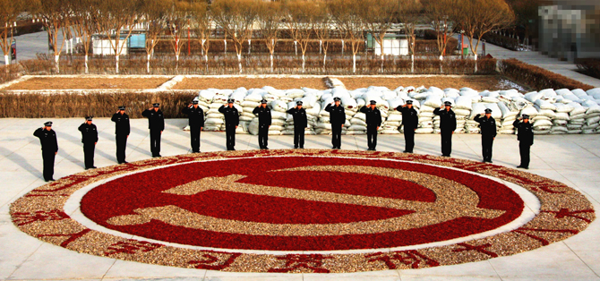 党的十八大以来,阿克苏监狱组织民警职工深入学习党的十八大精神,党的新思想、新观念,好政策、好方法深入人心,进一步加深了民警对党的感情,坚定了忠心献给党、坚决跟党走的信念,为表达对党的忠诚和热爱,监区民警集思广益,拼制了这幅巨型的党徽。