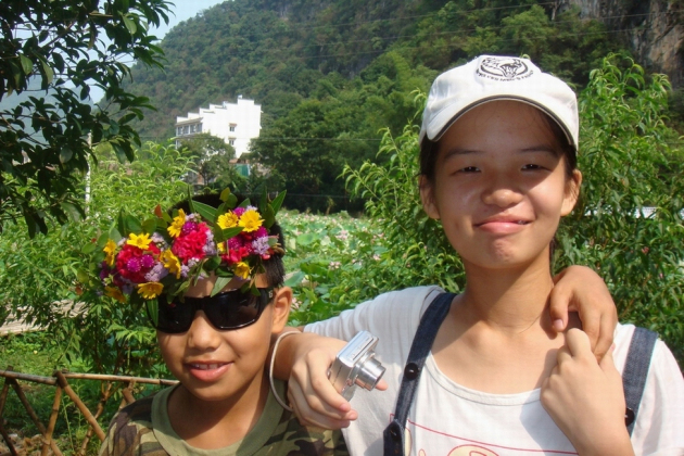 监狱子弟一向好山乐水,夏天更是玩耍的好季节。跟小姐姐去玩,忘了戴帽子,就摘一串野花,扎成遮阳的花环,带在头上,帅气又神气,还不忘攀着小姐姐的肩对着镜头炫一下夏花的美丽(见图一)。