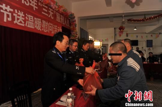 活动现场,垫江监狱民警为“三无”服刑人员送上春节慰问品。 薛会胜 摄
