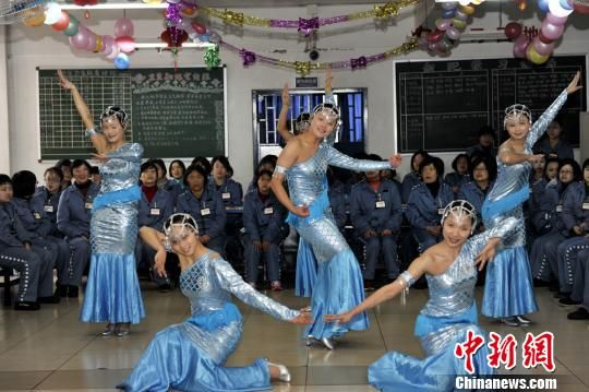 成都女子监狱阳光艺术团的服刑人员正在表演舞蹈《年年有余》。 安源 摄