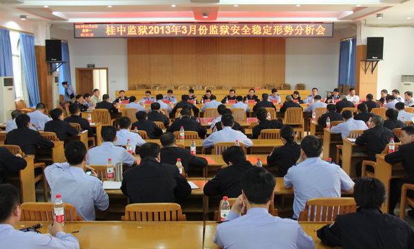 3月25日上午,桂中监狱召开2013年3月份安全稳定形势分析会。监狱、公司领导、调研员,监狱基层单位正职领导、主管改造的副监区长,机关科室主要负责人及管教线副科长等近90人参加了会议,会议由李斯育副监狱长主持。