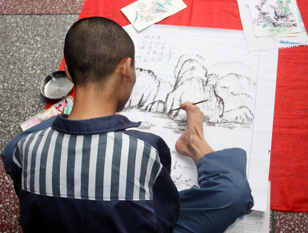 就在大家为王禾的事一筹莫展的时候,王禾利用学习文化课的时间,用脚来学写字、画画。起初,只是练练,半小时、一小时、两小时……后来时间越来越长。民警一方面鼓励他不要放弃学习绘画的想法,一方面关心他,为他提供了绘画专用纸。3年来,他只要一有时间就习画,从未间断。他的右脚在长期的练习中磨出了厚厚的老茧。在学画中,王禾找到了自己的精神支撑,绘画水平也在不断提高。