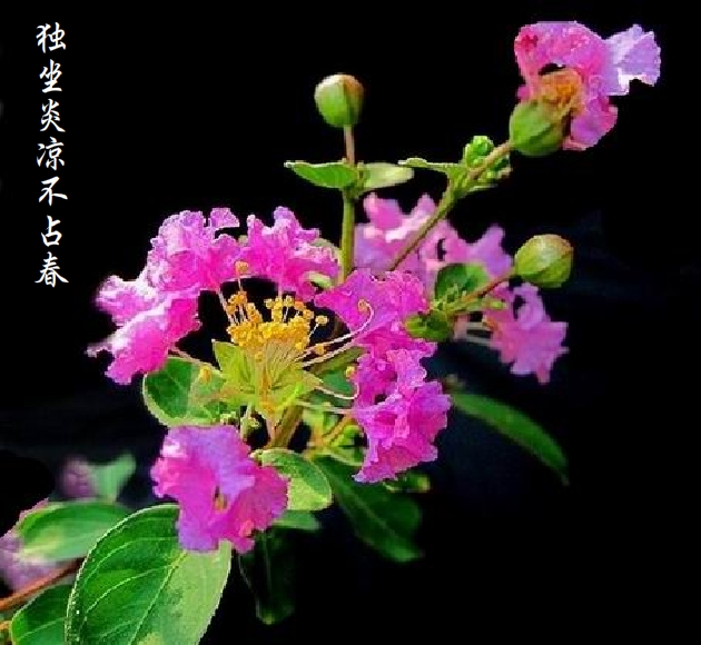 句出杜牧《紫薇花》:独坐炎凉不占春,晓迎秋露见高贞。满园桃李今何在?向月一枝最喜人!