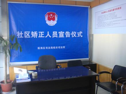为进一步规范社区矫正工作流程,体现社区矫正程序的严肃性,瓯海区司法局梧田司法所设立了社区矫正宣告室。用于社区矫正人员的入矫和解矫宣告,并兼用谈话室、集中教育等场所。同时,制订了相关制度、标示上墙。