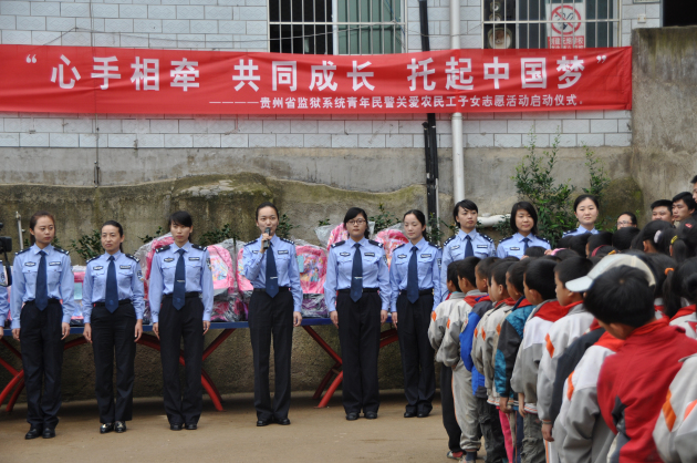 2013年5月31日上午,由贵州省监狱管理局团工委主办,省司法警官学校承办,监狱系统贵阳片区7家单位21名青年民警共同参与的迎六一“心手相牵 共同成长 托起中国梦”――贵州省监狱系统青年民警关爱农民工子女志愿活动启动仪式在贵阳市扶风农民工子弟小学隆重举行。省监狱管理局团工委副书记朱芳出席启动仪式。