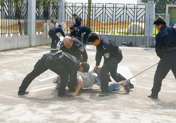持盾队员按等边三角形站位,用一人高的大盾一边保护自己,一边压缩暴乱犯人的活动空间。艾滋病犯穷凶极恶,张牙舞爪,面对训练有素的防暴队员却无计可施,很快被抓捕器勾住腰,进退无路,再被勾住脚踝,掀倒在地。持盾队员随即将盾压上,戴上手铐、头罩,杜绝继续行凶的可能。三名气焰嚣张,负隅顽抗的暴乱犯人在装备精良、训练有素的防暴队员面前毫无反抗之力,在一分钟内被先后制服。