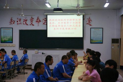 6月24日下午,杭州市拱墅区禁毒办、米市巷等10个街道的禁毒社工和志愿者一行40余人,到省强制隔离戒毒所开展帮教活动,实地参观所区,仔细聆听戒毒人员的现身说法,并与戒毒人员进行面对面的座谈交流,鼓励他们坚定信心、戒掉毒瘾。座谈交流结束后,禁毒社工和志愿者们还向戒毒人员赠送了《心灵的日出》等励志书籍。 (省强制隔离戒毒所 黄海华)