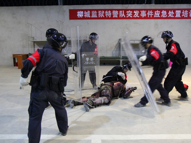 为搞好特警队集训,柳城监狱于4月就做好了筹备工作,在警力非常紧张的情况下从机关和基层监区抽选出30名监管工作经验丰富、业务素质强、身体素质较好的民警成立了特警队,其中,包括两年女民警。还专门从广东请来六名有丰富实战经验的教官,从擒敌术、防爆器材使用、战术及防暴队形、突发事件处理等多个科目着手,对特警队员进行培训。