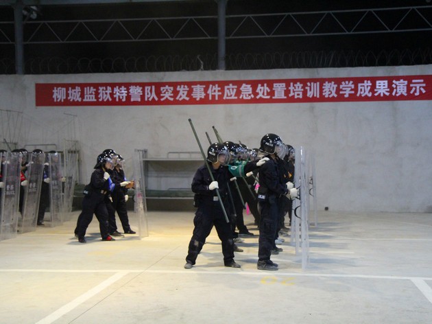 为搞好特警队集训,柳城监狱于4月就做好了筹备工作,在警力非常紧张的情况下从机关和基层监区抽选出30名监管工作经验丰富、业务素质强、身体素质较好的民警成立了特警队,其中,包括两年女民警。还专门从广东请来六名有丰富实战经验的教官,从擒敌术、防爆器材使用、战术及防暴队形、突发事件处理等多个科目着手,对特警队员进行培训。