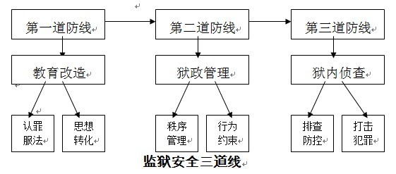 教育改造在监狱安全防线中处于第一道防线的地位,原因就在于它通过内在的思想、法律、道德、政策和前途教育,能稳定70%以上罪犯的改造行为,转化他们的大多数人的思想,使他们能认罪服法、遵守监规,某监狱教育科年上报数据统计,押犯年改好率达95.27%,违规率在5%以下便是例证。在监狱的安全防线中,相对于狱政管理和狱内侦查,它所处的地位见下表:(5)