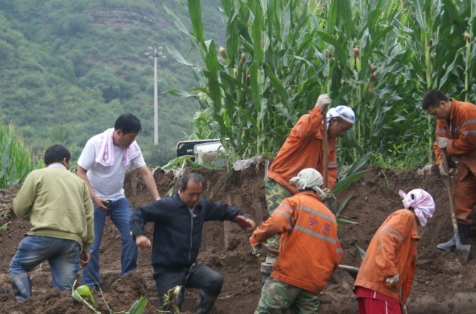 傍晚时分,马栏又下起了大雨。山洪穿过成片的玉米地汇集成急流冲击着公路。铲车刚开始工作就被稀软的淤泥陷住无法施展,雨中阴暗的山川,风声、雨声、玉米叶子的撞击声,统统埋没在激流中。按正常工序,抢修要等洪水退去,地面硬化后才能施工。但险情刻不容缓,正常的监管改造秩序刻不容缓,上万干职群众及服刑人员的生活用水刻不容缓!